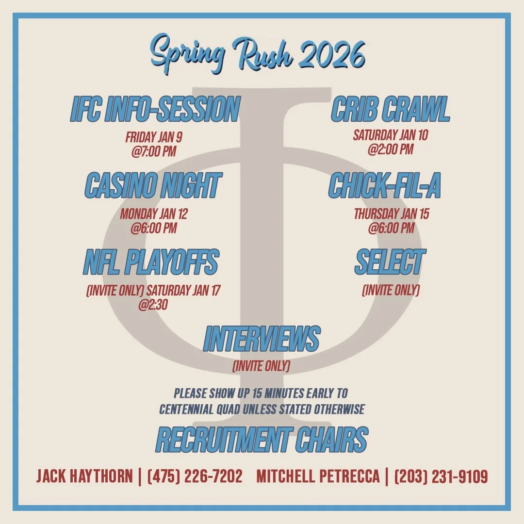 Rush is a series of social events that fraternities host to give potential new members (PNMs) a chance to meet current brothers and learn more about the fraternity. At Northeastern, there’s no formal rush period, but most fraternities host events during the first few weeks of the semester. Our rush typically lasts around two weeks, with a variety of events held throughout. At the end of rush, we extend "bids" to PNMs who are the best fit for membership.